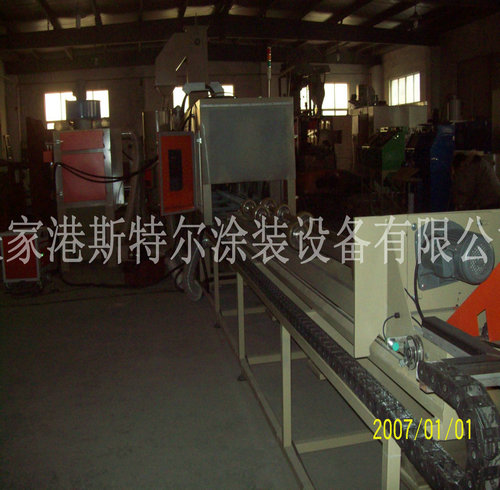 管類產品工件,如:鍍鋅鋼管、槽鋼、拉杠、螺栓、大形柱體、圓罐類、柱體型鋁件;選用雙槍(可按規范多槍)及颶風式除塵設備器和光學光感應特點,增進了生產率及大幅度的減小了修補率。 (此儀器需預先)
